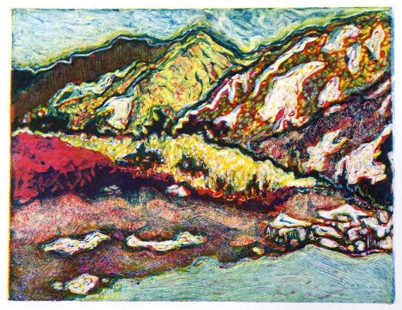 When I came back home to Wales I created a full-colour monotype from my original sketchbook drawing. After travelling from Islamabad, through Abbotabad, we arrived in Besham at night in total darkness and when we woke up the next morning this fabulous view of the river and mountains greeted us.