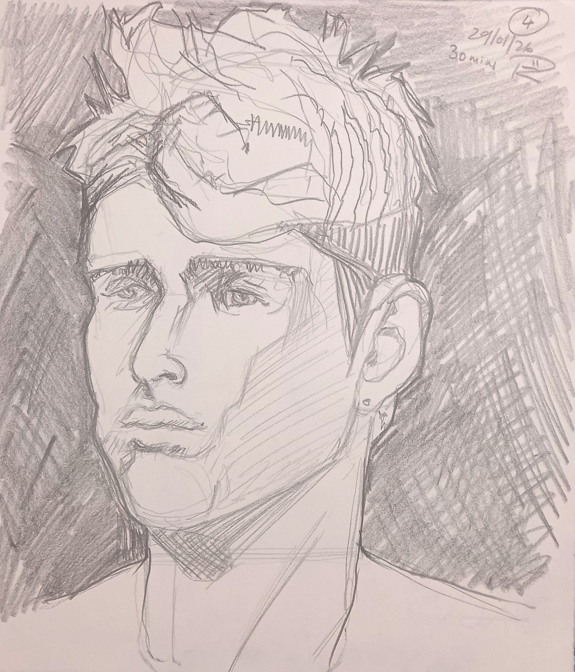 This is a longer pose from the recent life drawing session at Swansea Print Workshop, around 30 minutes. This model is definitely giving off boy-band vibes. I used graphite onto a heavyweight vintage paper (not watermarked).