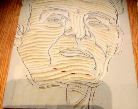 I guarantee that whenever I cut a block – lino, wood or vinyl – I will stab myself with one of my sharp tools and bleed on it! I blooded this block today, just as I was finishing carving it as well. I based this on an original drawing I did from life.