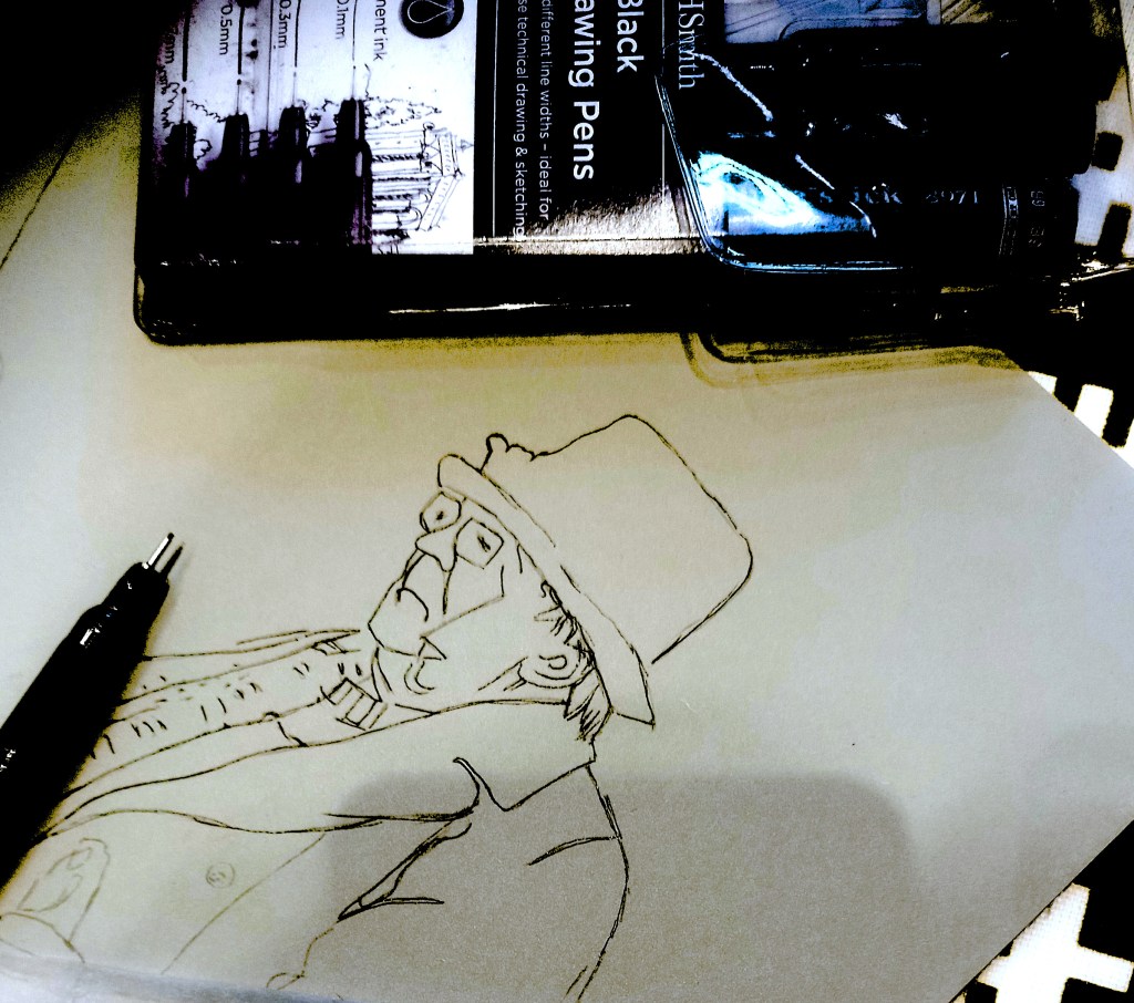 I’m cracking on with some work at my artist residency in Swansea’s Urban HQ . So far I’ve cut 11 small lino blocks and did some research drawing. I brought the 11 little lino blocks with me at the start, ready prepared for carving. I’m now moving on; I’m getting another block prepared for carving, a large one this time with a complex drawing. I’ve transferred it using tracing paper and graphite and now I’m inking over the graphite to make the mark more permanent.
