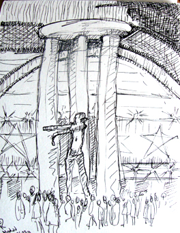 So where does Stonehenge come in? Outside the stadium was a plaza with a huge statue of a semi-abstract man in it and towering above it was an even more huge ‘Stonehenge’ thing made from concrete. We decided that if we got split up, we’d meet back at ‘Stonehenge’. About ten thousand other people decided the same! It’s an ink drawing in my sketchbook.