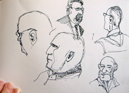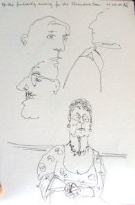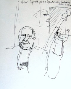 I carry my sketchbook all the time and take every chance I can to have a scribble. One night some friends invited us to a fundraising evening for the Arandora Star memorial. It was a great opportunity for sketching faces and I did some drawings there. The guest speaker was the veteran actor Victor Spinetti whose vast career included appearing in three Beatles films, apparently because George Harrison’s Mam fancied him! He is sweet and funny and an excellent raconteur. I did this drawing of him, but he was so animated it doesn’t really do him justice because he just wouldn’t keep still.
