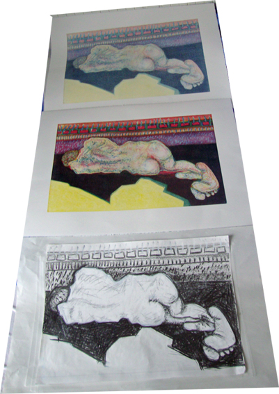 I spent Saturday at Swansea Print Workshop [www.swanseaprintworkshop.org.uk] developing a large piece of artwork which was based on a drawing I did at life drawing group, working with a professional model. I went in again this morning to finish it off. The technique I use is three-colour reduction monotype – for the uninitiated, that’s like a full colour oil painting onto paper, instead of canvas.
