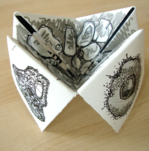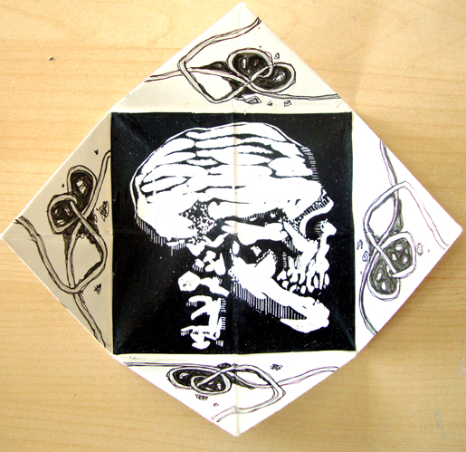 I’ve made two drawing / print constructions based on a traditional children’s game. ‘Pathogen’ is drawn from dangerous bacteria and viruses that attack the human animal. With the population of the planet increasing to huge numbers it becomes more likely that our species will be slaughtered by these or similar pathogens. The central image of a skull is a lino block print developed from original anatomical drawings. Cheerful aren’t I?