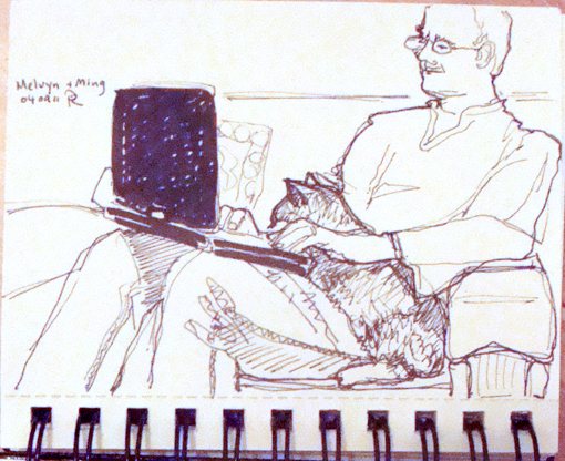 It’s funny how cats choose their people. All the cats that have lived with us have preferred one more than the other. Little Ming has been Melvyn’s cat from the start; she follows him around and she’s especially clingy when he’s using his computer. She rolls about on his PC keyboard and pushes in between him and the screen [just like the new Simon’s Cat cartoon] and he can’t sit on his own with his laptop; it’s obviously been made as a cwtch for a small fluffy cat. She twists herself into all sorts of daft positions so she can squeeze herself around his computer.