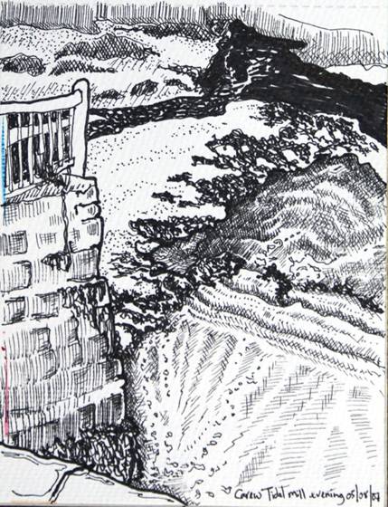 The drawing is done in Faber Castell Pitt pens into a Cotman Watercolour sketchbook and the photograph has been digitally altered in Adobe Photoshop. I had to lean over the top of a rickety bridge to scribble and it was challenging drawing moving water with pens. The water flowed quickly as it’s tidal and so the subject was constantly changing.