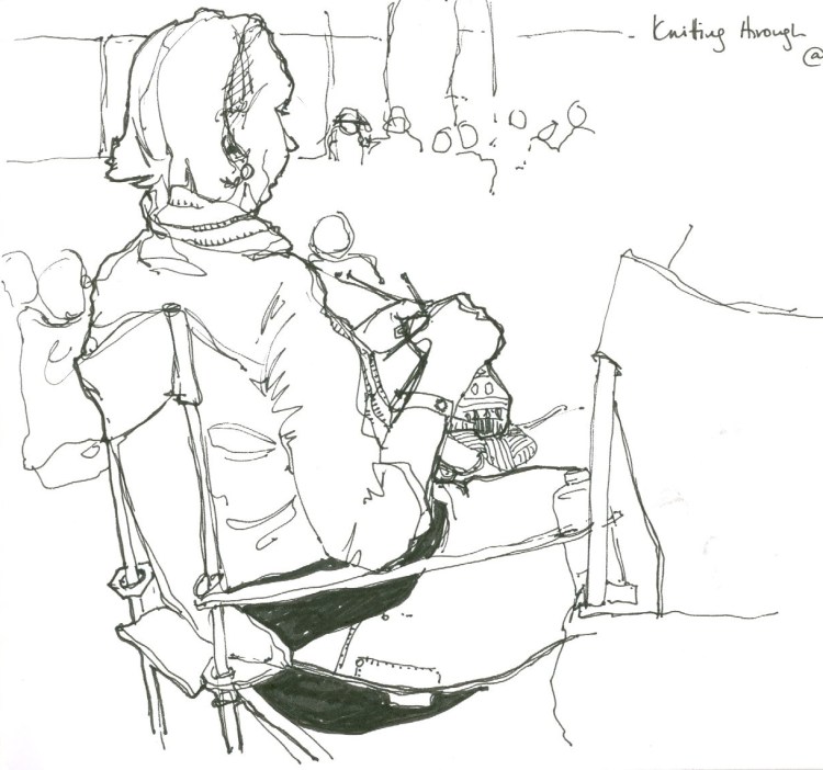 Just a very quick blog tonight because I’ve been at the studio all day then I was working at the opening of the exhibition at The Brunswick all evening and just got back home. Here’s a sketch I did a couple of years ago at The Green Man Festival in Usk, a beautiful part of Wales. Very laid back festival, this lady had positioned her chair on the main field and knitted throughout the set. Patterned socks they seemed to be.