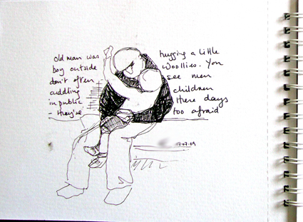 This elderly man was cwtching a little boy, maybe his grandson? They were playing together and having loads of fun, tickling each other. They were hard to draw because they were moving about so much but I tried to capture the essence of them, rather than try and get a good likeness. It’s unusual these days to see a man and small child playing together and so wrapped up in each other. Delightful.