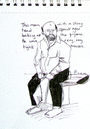 This old chap sat straight as a ramrod, possibly an old soldier. He stayed for some time, watching people pass by, so I was able to get a reasonable amount of detail in my drawing. He had the tightest trousers I’d seen in a long time!