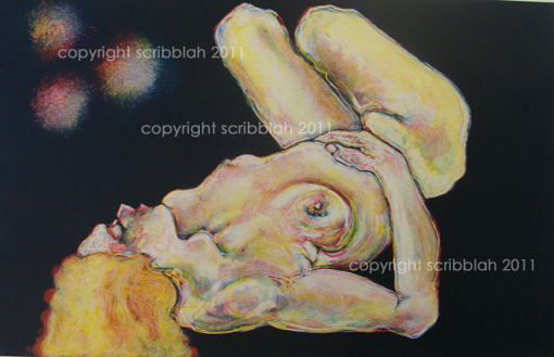 I spent the whole day at Swansea Print Workshop, making a new large full colour monotype. Here it is. It started life as a sketchbook drawing done during the weekly life drawing group at the Workshop. I redrew it, scaled up onto a much larger sheet of paper in conté, charcoal and white pastel. I traced the large drawing onto tracing parchment and used the reverse as my template for the monotype. It’s a very labour-intensive process and I’m too tired to think now so I’ll just post the full-colour piece and blog an explanation of the process tomorrow 🙂