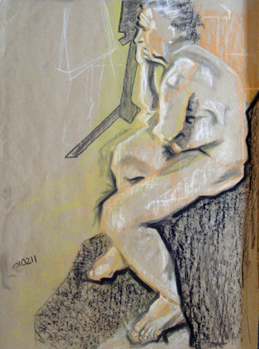 Life drawing was a regular item on the curriculum when I was at Art College and I’ve kept practicing, going to local groups and classes for many years now. It’s good to work with different models and to be inspired by the techniques of artists in the group and I link the life drawing to my anatomical studies of Felicity, the skeleton I borrowed who lives in my studio, standing in a window overlooking the street, scaring passengers who look up from the bus stop below. I like understanding how the mechanics of bones work under the skin. This drawing of one of our older male models was done in chalk, compressed charcoal and conte crayons onto brown wrapping paper. It’s pretty large, about A0 and I’ve barely managed to fit the figure into the space. Egon Schiele had the same problem, so I’m in illustrious company. This model is short but otherwise monumental and I think I’ve captured a sculptural quality in this drawing, which is very much like him.