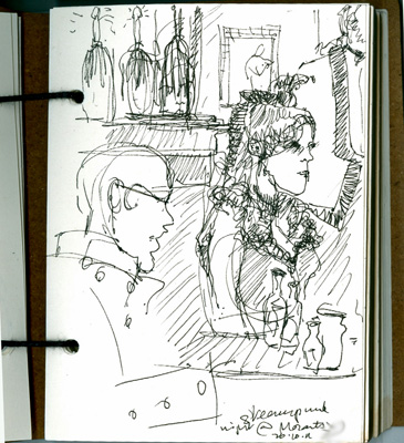 The eclectic mix of strange Steampunk music was reflected in the diversity of costumes, from authentic Victorian and Edwardian dress to sci-fi steampunkery at it’s most outlandish. I wasn’t able to stay long so just did a few very scribbled drawings. This lady in her finery is bathed in candlelight reflected in the mirror above the fireplace and looks for all the world like she is sitting in some Parisian bar in the late 1800’s, being sketched by the likes of Toulouse-Lautrec, Degas or Manet, not that I would ever compare my scribbles to such awesome artists!