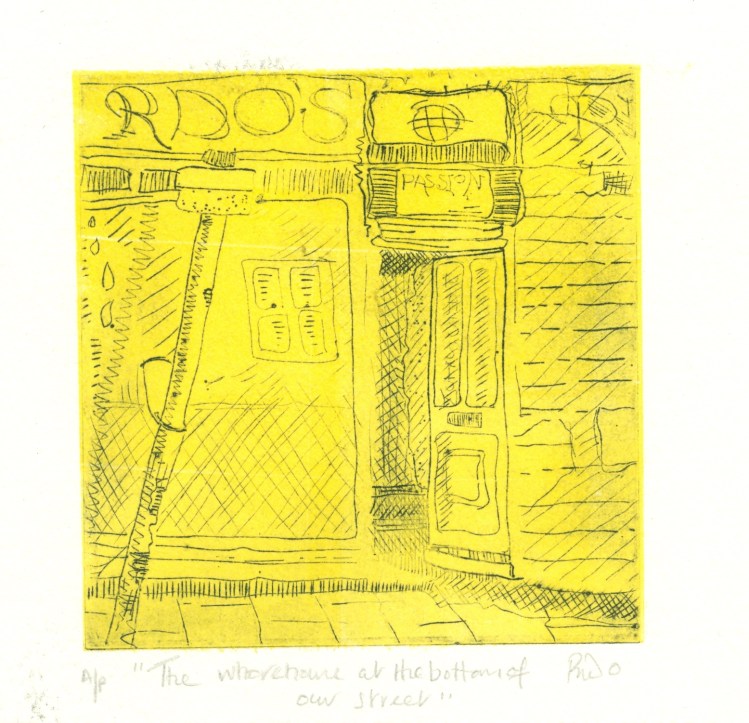 I like to draw from life and always carry a small sketchbook. I’m enormously inspired by the work of William Hogarth, who catalogued daily life in the 1700s with his meticulous metal engravings. This is a drypoint from a paper plate based on a sketch I did in a tiny Cotman sketchbook. It’s the brothel at the end of our street which is sandwiched between two restaurants. There are often red faces when restaurant patrons go through the wrong door and come rushing back out again pretty fast. The ladies from the brothel often hang out of their upstairs window, watching life go by and chatting to passers-by below. A very Hogarthian subject.