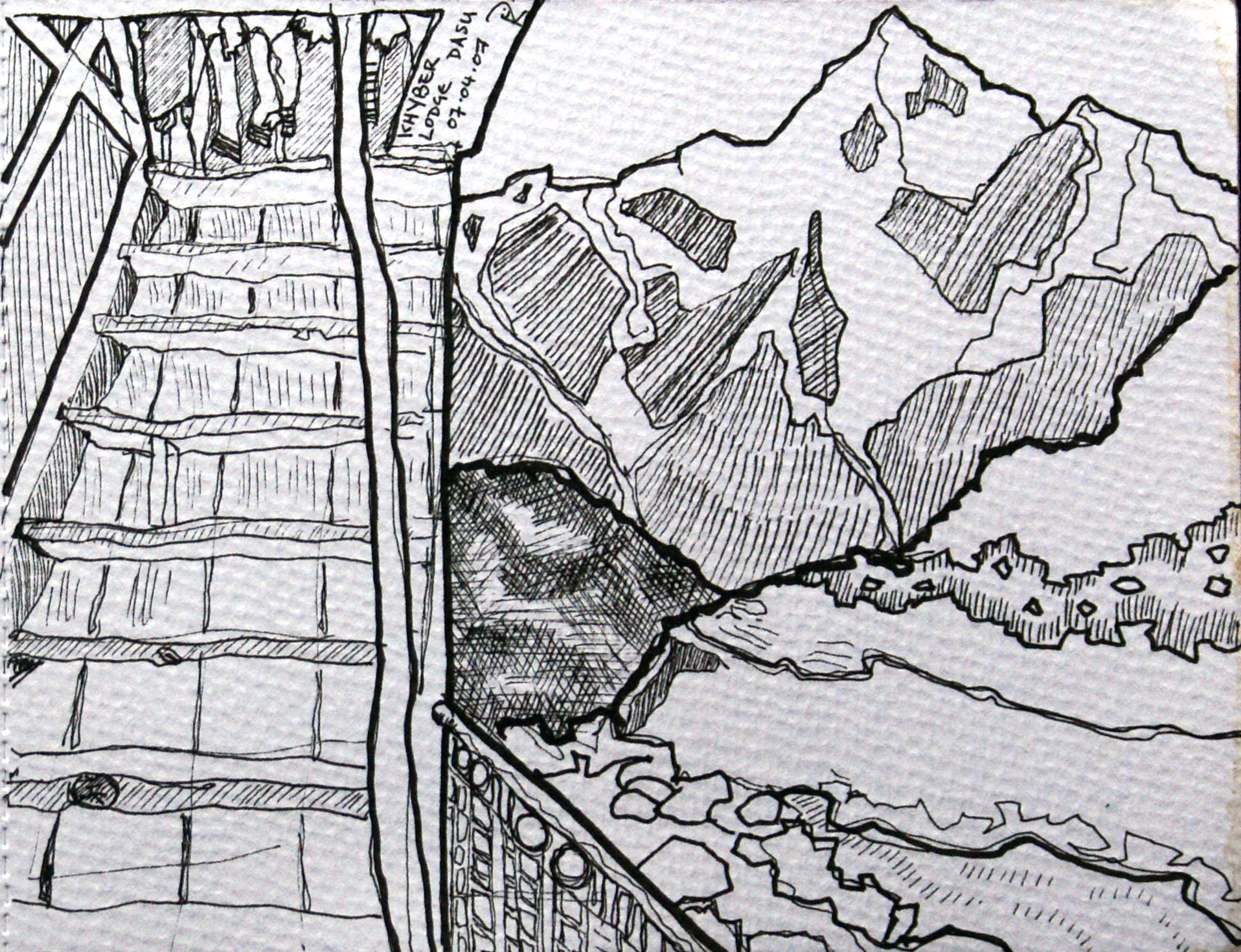 Travelling across Pakistan in a minibus 4 years ago along the Karakoram Highway, we stopped in Kohistan for lunch and a cup of tea. The ‘cafe’ was an ancient wooden building with wobbly rickety stairs on the outside leading to the flat roof. It was unbearably hot inside the dark little shack so we all traipsed up to the roof and lounged around on whicker sunbeds, snacking and drinking tea and gazing at the extraordinary mountains before us. For a comparison, Snowdon at 3,000 feet is the highest in England and Wales. These mountains were around 30,000 feet! The stairs, indeed the whole building, was very very rickety – no EU regs and Elfin Safety out here! The drawing is in Faber Castell Pitt pens into an A6 Cotman watercolour sketchbook.