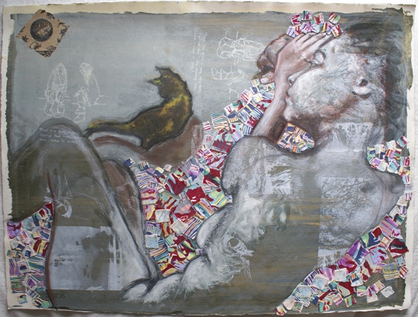 Anyhoo, I had a drawing I’d done while Anastasia was sitting on a large floor cushion which was covered with a very jazzy blanket. Sparta, who was then a kitten of about 12 weeks, came in and started playing with a scrunched up paper ball and I managed to capture the two of them together in a drawing, which we both really liked.  I decided to redraw it onto the screenprinted paper and as I was working on it, I took an old black-and-white blockprint that hadn’t worked out right and I coloured it with oilwashes and tore it up and collaged it onto the drawing to make the blanket. I drew in compressed charcoal and black and white conte crayon, overlaid with white and neutral oilbars. I wanted to make her body insubstantial and transient: it’s to do with my death obsession I guess. But I also like the domesticity of the scene, a woman watching a kitten play while she chills out is a very everyday and ordinary thing to do.