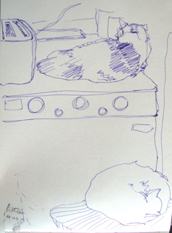 The drawing is in blue biro into an A5 bound sketchbook. The toaster didn’t last long. One of the cats puked into it! We think it was deliberate.