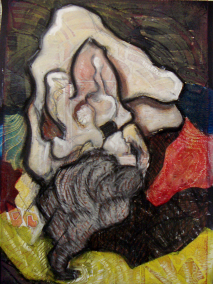 I often use discarded prints as the basis for drawing – I raid the waste paper bin at Swansea Print Workshop for prints that other artists have thrown away as they’re usually on really good paper, a Somerset or Bockinford, and often embossed and coloured which makes an interesting starting point for a drawing, introducing an element of chance into it. I did this drawing earlier in the week. It’s based on a very small sketchbook life drawing I did a few years back and it’s been worked up mainly in oil bars and compressed charcoal onto a highly coloured collagraph print – you can see the embossed patterns particularly under the dark areas. I have no idea who did the original print – it might have been a schoolchild during one of the community outreach sessions.