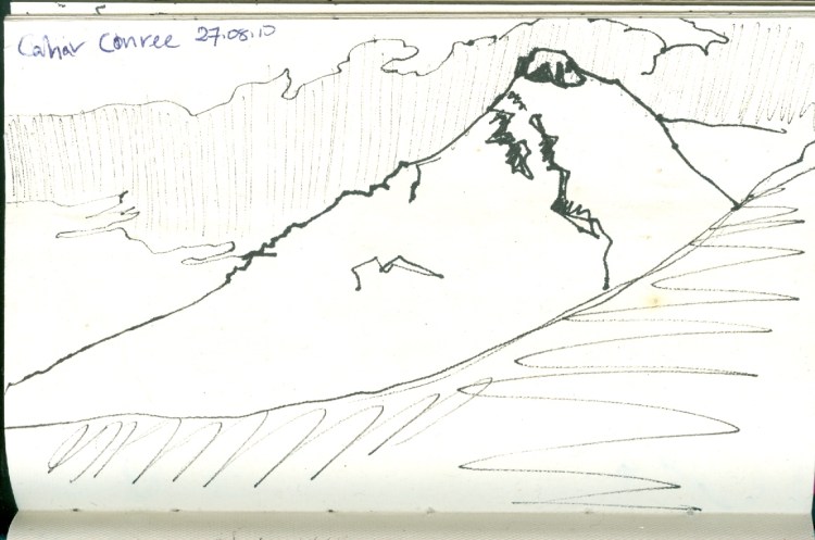 Unlike me. I rarely do landscapes but now and again, when I’m off travelling, I have been known to make the occasional study. It usually takes me all of three minutes 🙂 ! And they rarely exceed an A6 page. Here are two quick scribbles I made last year during a trip to Ireland. We took a back road and crossed a mountain range on our way to Dingle in County Kerry – it’s called Cahir Conree. Faber Castell Pitt drawing pens into a silk-bound A6 sketchbook.