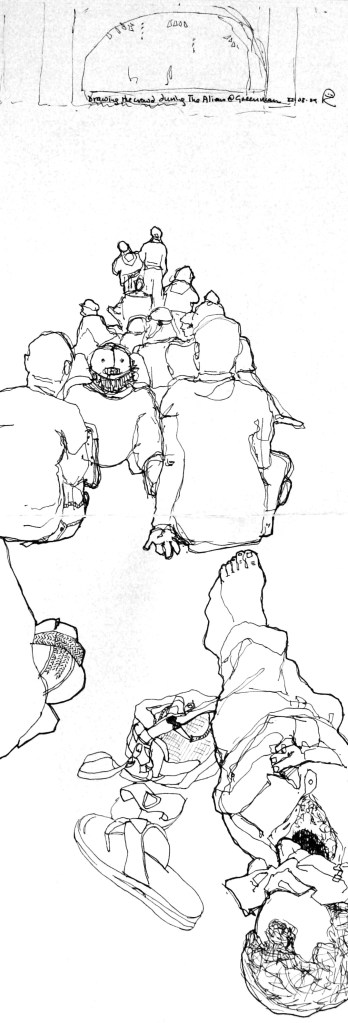 I find it hard to know where to start a crowd drawing but this one was easier than usual because I was at the top of a slope looking down which gave an exaggerated perspective that I really like. I couldn’t be bothered to put in lots of little dots and circles to represent the crowd down the bottom, the sunshine and ambience got to me and I shut my sketchbook and chilled out. That sounds like a good idea – zzzzzzzzzzzzzzzzzz