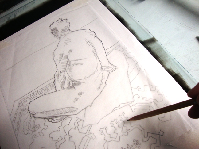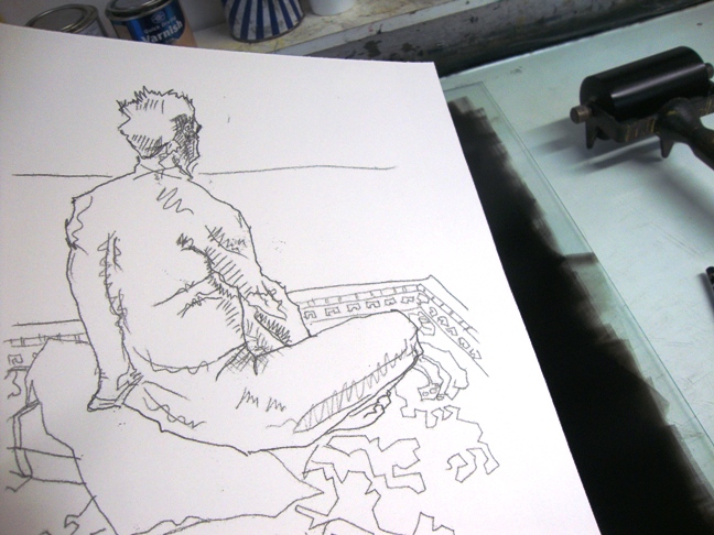 I spent a happy morning yesterday making some direct line monotypes down at Swansea Print Workshop. The trick to getting a good result is to roll out your ink VERY very thinly. I used Intaglio Printmakers oil-based litho/relief ink in black and a Japanese rubber roller inked onto apiece of Perspex. Don’t be tempted to add more ink because your paper will stick to the plate and there’ll be an awful blobby mess instead of some lovely lines. I based my monotypes on some life drawings I had done and I made tracings and reversed them and stuck each to the back of a piece of paper.