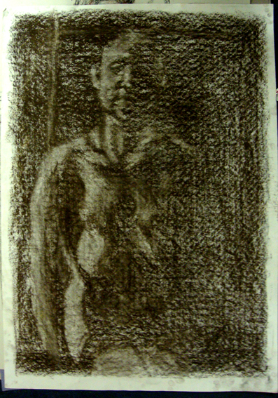 I’ve been clearing out my studio because I’m moving to a new, bigger studio over the road and I’m finding loads of work I’d forgotten about lurking at the bottom of my plans chest. This one is a large, A0, charcoal reduction drawing. I started by covering the paper with a layer of compressed charcoal [I had the paper on top of a slightly textured board]. Working directly from life, I’drew’ the highlights by removing the charcoal with a putty rubber [Blu Tack works just as well] The end result is ghostly and ethereal. It helps me technically to focus on the high- and low-lights which is quite a good exercise to do.