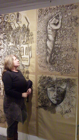 It was about the time that Ai Wei Wei had ‘disappeared’ in China and my drawing refelcted on the artist’s role and how vulnerable we are if our art challenges political, social or religious norms. I’m looking at my drawing top right, above a work by Sandra Demar and Tim Kelly’s work just behind me. It was brilliant that so many artists turned up just to enjoy the act of drawing together, done on a shoestring, no public funding, advertised by word of mouth and social networking. It was also good that so many members of the public were able to see artists at work. We’re usually closeted away in our studios, houses, garden sheds and garrets.