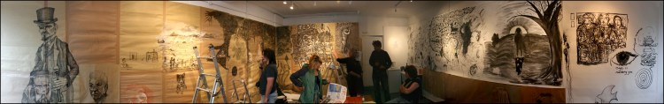 A few months ago, some of the artists involved in Artawe got together and did a big draw at Elysium Gallery, taking over the space for a week to, well, just to draw. A few of us stapled huge sheets of brown wrapping paper to the walls and the word went out to local artists to come in and draw all over them with charcoal and chalk. Just like we were told NOT to do by our Mams when we were little. We started on a Saturday and continued throughout the following week until the gallery was full. It was open to the public and we were in fullview through the large windows. It was photographed and a short film made of it and then it was ripped down and binned. Ephemeral art indeed. Here’s a photo of the whole thing by Chris Harrendence who drew the amazing top-hatted man on the far left.