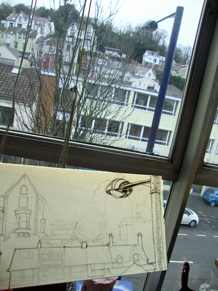 It’s unusual for me to draw anything other than people and the odd animal but there’s an interesting jumbled cityscape scrambling up the hill opposite the window in my new studio. I’ve injured my foot and my chiropodist asked me to keep off it as much as possible for a few weeks. A few weeks!!!!!! It’s terrible. You only realise how physical art is when some of your body is out of action. Keeping off my feet means not doing any printmaking, not working at the easel, not doing anything large at all. I’m using the time to catch up with admin [tax returns yuk!], reading and research [I have a year’s worth of back copies of a-n magazine to get through] and some chair-based sketching. So to push my artistic boundaries I thought I’d start drawing the cityscape opposite.