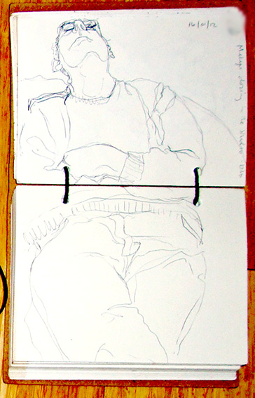 We went into the new studio over the weekend and completely re-arranged the space because I wasn’t comfortable working in it last week. Today was so much better. I finally settled back into some drawing after the Xmas break and the studio move. Husb came over at lunchtime and brought some meatball and melted cheese sandwiches, home made in the lovely little café opposite with their own chilli sauce – HOT! He had a catnap in the chair and so I grabbed my sketchbook – never miss an opportunity. Great chance to get a rare up-the-nose angle. The sketch is in biro, which I’m really getting into at the moment, into my recycled, leather-bound A6 Artbox sketchbook.
