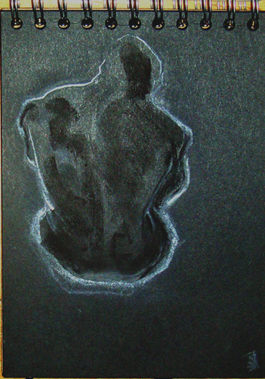I spent the rest of my time there working through some exercises from Sarah Simlett’s book, ‘Anatomy for the Artist’. I’m planning to do a small series of editioned block prints, probably lino, over the next few weeks – bit tired of monotypes at the moment- and I needed some inspiration. I find it often comes if I do some technical studies and after a couple of pages of hand studies, I started drawing one of the figures into my black A5 Paperchase, spiral-bound sketchbook. I restricted myself to white chalk and black compressed charcoal, which gives a different black to the background paper and I minimised the detail, emphasising the outline. I think I’m heading in the right direction; it needs to be a pared-down design for a block print.