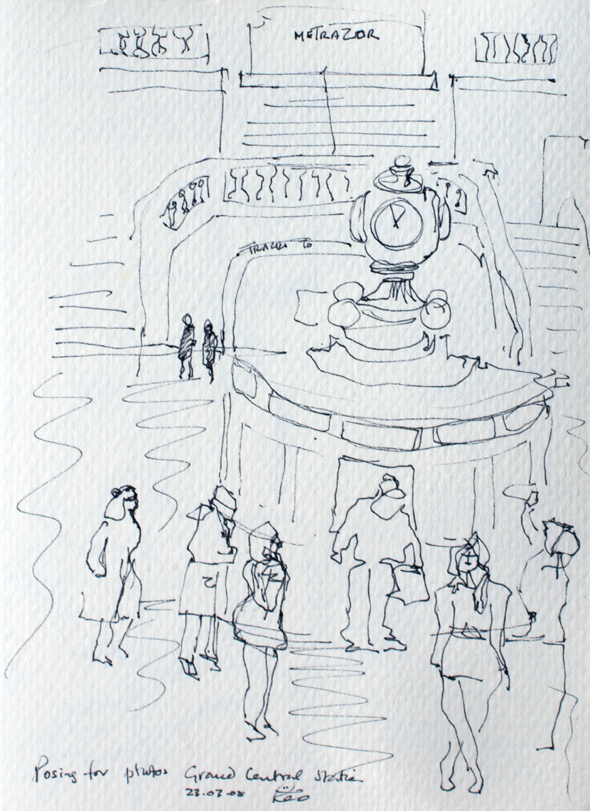 I’ve been to New York City a few times and Grand Central Station is one of my favourite place – it’s in the film Madagascar which I love! My husb took some terrific black and white photos of this scene while I scribbled it – very film noir – and I noticed a woman posing in the foreground. I don’t know if she spotted us but it seemed so. It’s a very quick sketch, just a couple of minutes, but I spent quite a lot of time sitting in the dining concourse, which is beautiful, sketching people at length.