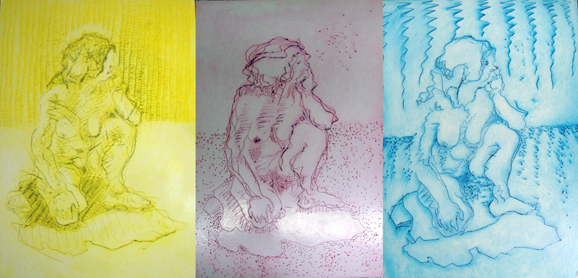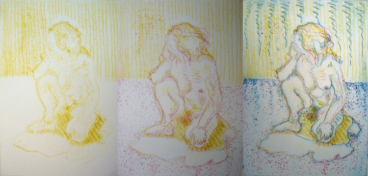 I spent today at Swansea Print Workshop learning how to do three-colour separation drypoint, which is similar to etching. You transfer a drawing to three separate, identically-sized paper drypoint plates. You use a drypoint needle to scratch your drawings into the plates, using your original drawing as a guide. Each plate is inked up with a different colour – Process Yellow, Process Red and Process Blue.