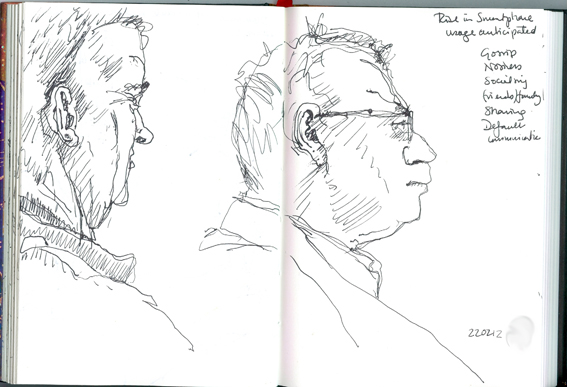 Didn’t get a chance to blog yesterday because after the studio, I went with Husb to Cardiff for a seminar on social networking research. Interesting data, surprising how YouTube is far more popular than Twitter in Wales. Seminars and conferences are great places for head studies, because people tend to be very still and quiet, listening rather than chatting as they are at the theatre, cinema or gigs. I like these two men’s heads, they’re full of character. Drawn with my favourite new pen, a Pilot V5 Hi-Techpoint 0.5 into my A6 cat-themed sketchbook.