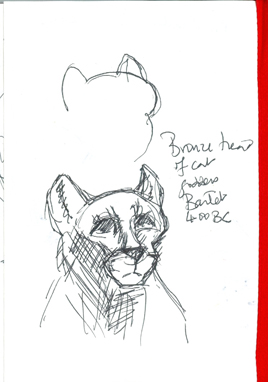 Babysitting again today so took my young nephew to Swansea Museum, the one that the poet Dylan Thomas described as ‘the museum that should be in a museum’ because it’s such a quintessentially Victorian museum, so very typical of its era. We went up to the Egyptology exhibit, because small children seem to be fascinated by mummies – I can remember feeling the same when we had primary school trips to visit the museum. While the young sprog drew the massive sarcophagus, I scribbled away at a small head of the cat goddess Bastet, dating from about 400 BCE. When you look at it, the unassuming little sculpture seems very simple but when you try to draw it, you realise just how complicated and beautifully made it is. It’s a lovely example of craft in art and the craft of art. I’m a big fan of Grayson Perry and this little sculpture reminded me of his exhibition at the British Museum, The Tomb of the Unknown Craftsman, which venerates all those long-dead craftsmen who made great, wonderful art. My quick little scribble doesn’t do it justice.