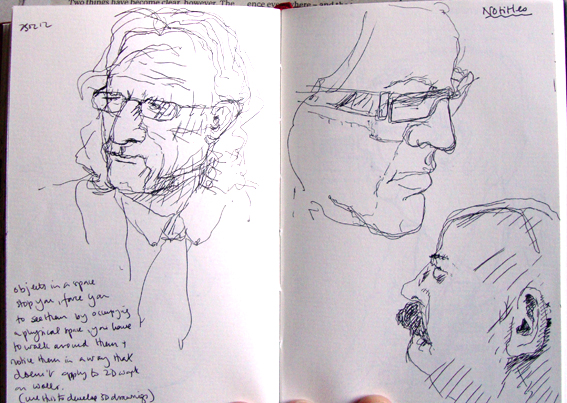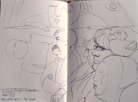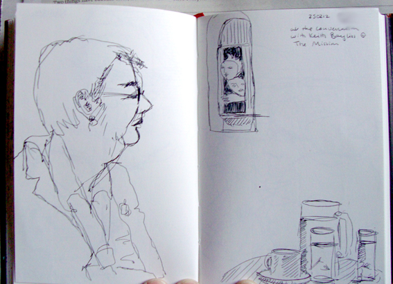 Husb and I visited the Keith Bayliss exhibition at the Mission Gallery again today for a talk by the artist. It was a good opportunity to scribble plenty of faces as well as to listen to a very experienced artist explaining his work and his art practice. Keith is a warm, practical and very dedicated artist who has moved away from his usual practice as a painter to create a site-specific installation combining painting with sculpture and sound collage.