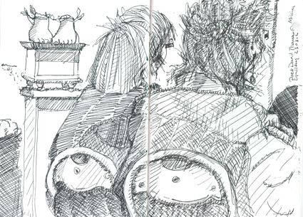 Spent an hour or so at the closing event for Keith Bayliss’ exhibition at Mission Gallery, The Enclosed Garden; it was such a fabulous exhibition, I haven’t experienced anything quite like it before. It’s been a terrific success with many visitors coming back several times because it had such an impact. It’s intensely spiritual but not in a religious sense, with a mixture of sculptures, paintings and a soundscape, designed especially for the gallery, which used to be a chapel for sailors from the days when Swansea was a thriving port. I was tucked away at the back opposite a lovely tiny sculpture of two disembodied feet with wings, so I drew them. And the ladies sitting just by them.