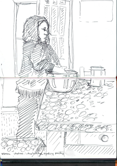Ink sketch: making pies.