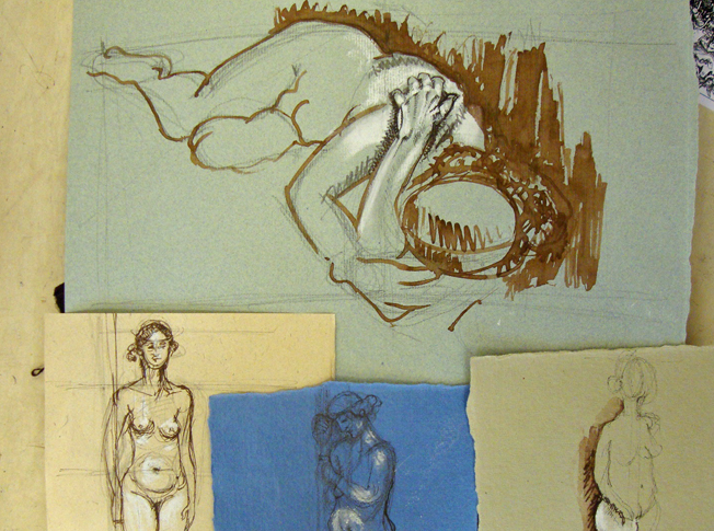 Our teacher asked us to do a drawing with different media, using a rougher medium for the overall drawing and focussing in on a detailed section with a finer medium. I used a seagull quill and sepia ink for the main drawing above and a fine nib pen and chalk to develop the detail in the left hand. The local seagulls are a nuisance who rip open bin bags, cover cars with guano and steal food from small children, so it’s good to find something they’re useful for.