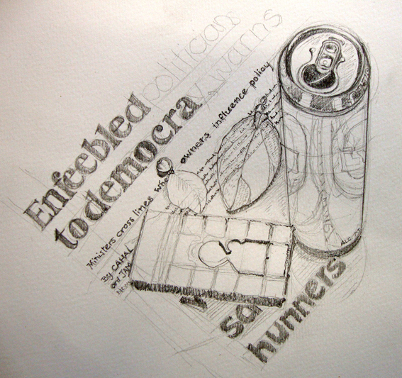 I’ve been collecting things I find in the street [that would horrify my late Nana] and today I decided to start drawing a still-life with them. Here’s what I’ve done so far. I found an empty cheap extra-strong lager can left on the Studio doorstep by a street drinker; two goldie-coloured metal leaves; an icon. An eclectic mix from the mean streets of Swansea. I put them onto a page from the Independent newspaper. The drawing is in Derwent pencils, B and 5B, onto 90 gsm watercolour paper and I’m toying with the idea of using watercolour wash when the drawing bit is finished. I’ve been wanting to do some still life for a while but also wanted to do something contemporary, so collecting rubbish off the street seems to fit the bill. Or am I having another Senor Moment?