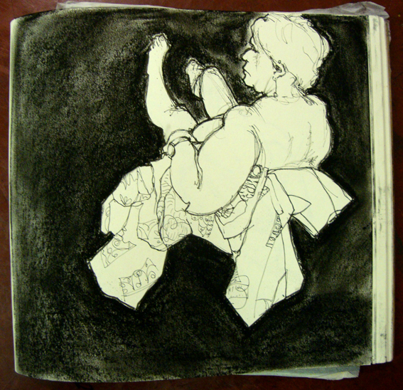 The drawing is in Faber Castell Pitt drawing pens, sizes S, M and B and compressed charcoal into a 30cm squared Bockingford sketchbook. I stood very close, hovering above her to emphasise the foreshortening.