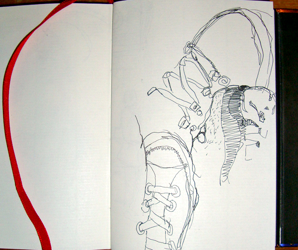 Sometimes I just don’t want to do any drawing in my sketchbook. I spent a few hours in the studio, working on a large piece with oilbars and wiping most of it off with bits of rag and I really didn’t want to sketch. But I forced myself to, because it’s a completely different sort of drawing to the studio work and I think it’s good discipline for me. It doesn’t have to be a detailed, finely wrought piece of work, it’s just chilling out and having a scribble. So I did a quick sketch, just a few minutes, of mine and Husb’s booted-up feet lounging together on a footstool [there’s romantic]. He’s wearing his well-worn walking boots and I’m wearing my new Converse bumpers. I don’t know what they’re called these days. When I was a kid they were daps, then bumpers. My parents called them gyms. I bought them a couple of weeks ago when my 12 year-old great niece dragged me into a posh shoeshop and ordered me to buy some decent shoes because, apparently, my fashion sense is ‘awful’. That’s news to me. I didn’t know I had any fashion sense.