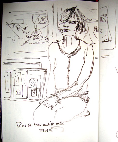 Just got back from an excellent talk by the new artist-in-residence at Swansea Print Workshop as part of the year-long ‘Drawn To Print’ project. Her name is Ros Ford and she’s primarily an etcher, working on huge copperplate etchings of urban industrial landscapes. I did a quick scribble during her talk, which doesn’t do her justice so I hope she doesn’t see it. She’s with us for a couple of months and she’s running some workshops, starting this Saturday, with one designed mainly for artists who draw, but don’t print and it’s aimed to ease them gently into printmaking. All Ros’ practice is based on drawing from life. If you’re around this Saturday and fancy doing this workshop [or one of the future ones] you can book online on the Print Workshop’s website.