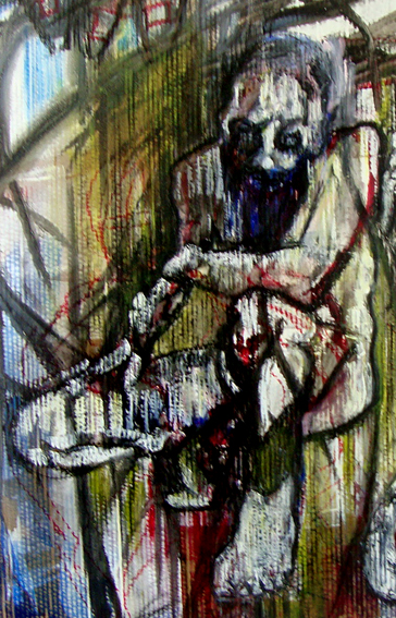 It’s on quite a large scale, about four times the largest I normally use and I’m working onto primed heavyweight cardboard with litho/relief inks [oil-based] applied with squeegee, roller and pallette knife and using oil bars for the detail. So it’s sort of paint. But I don’t use a brush – ever. It also involves a lot of rubbing off with rags and scraping with all sorts of implements. I’m having a good time. This is a detail. The finished piece has three figures – male, female and child. This was the man as of last night. I’ve done a lot more work on him but I forgot to take my camera in today. It’s a pretty grim image but that’s okay because I wanted to see how far I could portray a concept, a state of being, using just human figures with little else to contextualise them. It might fail miserably but I’ll know by Friday.