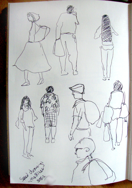 Getting a bit stir crazy in the studio today so I went out into the street for ten minutes or so mid-afternoon and did some speed scribbling of passersby. I don’t try to hide but people rarely seem to notice me. The guy on the top right, who was swigging from a can of beer, grinned at me from far off and as he walked past said, “Lovely drawings Darlin'”. He wouldn’t have been able to see them but it was nice to get a compliment 🙂