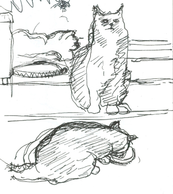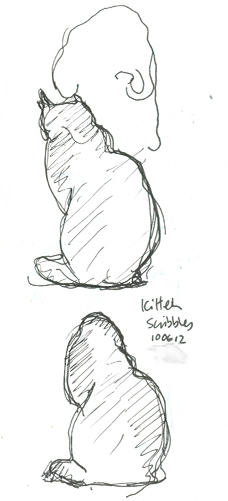 Some days I really don’t want to draw. Mostly though, I grit my teeth and do it because I don’t want to fall into the trap of being undisciplined. That’s when the cats come in handy. They’re great for speed sketching because, unless they’re snoozing, they don’t keep still for long, they’re very fidgety little animals and that’s what you want when you’re only in the mood to do a few quick scribbles.