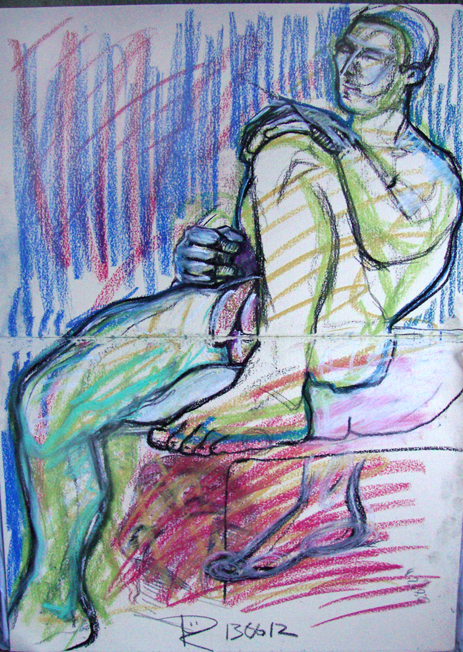 Anyway, here’s our soldier model who posed last night. This was a difficult one to draw. I deliberately went for an angle that gave me some foreshortening; his left foot was quite close but he was leaning sharply away so his head was noticeably smaller. His hands took a lot of effort. It’s got potential; I might rework this as I like the pose a lot. It’s drawn with chalky pastels and compressed charcoal into my A3 Bockingford sketchbook, using both pages.