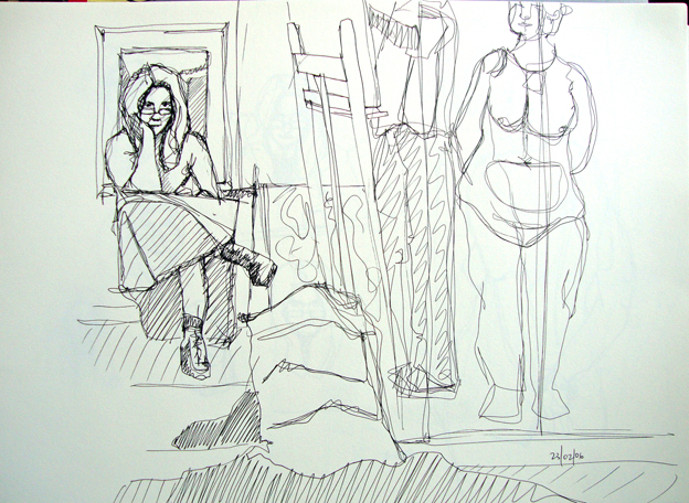 I’ve been photographing and cataloguing all my old sketchbooks, no small matter, there are dozens. This drawing is 6 years old. I was still using drawing pens but working on size A3 and sketching not just the model, but the life drawing room and whatever was reflected in the large mirrors. Here I am in the background with my well-worn and well-loved Hi Tec Magnum boots. They’re the most comfortable boots I’ve ever had. I bought them in the Army and Navy store. They had trouble getting my size because they’re supposed to be for men and I had to have the smallest ones and still have to pad them out a bit with socks. They have lasted really well, very good value. I first saw them when I did some training with the local police force and most of the officers wore them. I thought they’d look really good with thick woolly tights and a skirt. The chaps didn’t think so! 😀