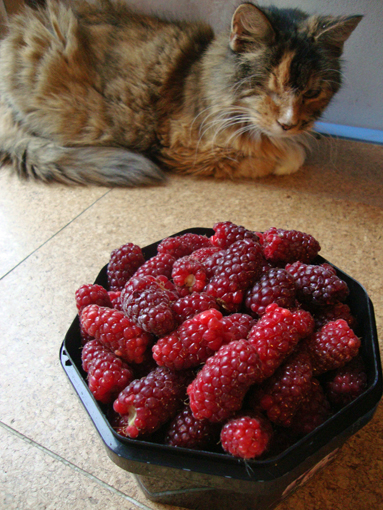 Does what it says on the tin – here’s a cat – and some berries :D. I did loads of drawings at the studio today and forgot to photograph them, so no drawings to blog tonight. But I have two of my favourite things to blog about instead – cats and gardening. These are loganberries picked this evening from my very small back garden. There’s about a pound and a half here and I’ve been picking a similar amount for about a week, with loads more ripening. Most of them will end up as home-made jam because we get tired of eating them fresh and loganberry jam is one of the most delicious things on the planet. We have an enclosed garden with tall Victorian stone walls. The loganberries are climbing up a south-facing wall and the microclimate is perfect for them. There’s a fig tree next to them and rhubarb below.