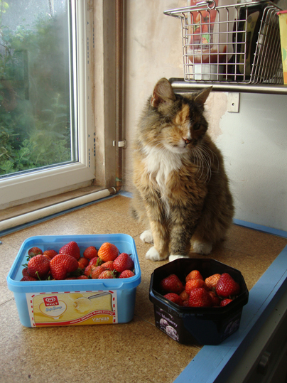 Another busy day, drawing in the studio then picking strawberries down on the allotment – the weather has been really bad for fruit. The heat and humidity are perfect conditions for botrytis and quite a few of our strawberries have been affected, so we’re picking whenever there’s a let up in the drizzle. It was a lovely sunny evening so we made the most of it before I caught the second half of the life drawing session at Swansea Print Workshop. I also picked up the photopolymer [solar] plates that I exposed yesterday. There’s Little Ming, above, with them and below, with today’s strawberry bounty. She likes posing for photos. That’s her boiler with a view that she’s sitting on.