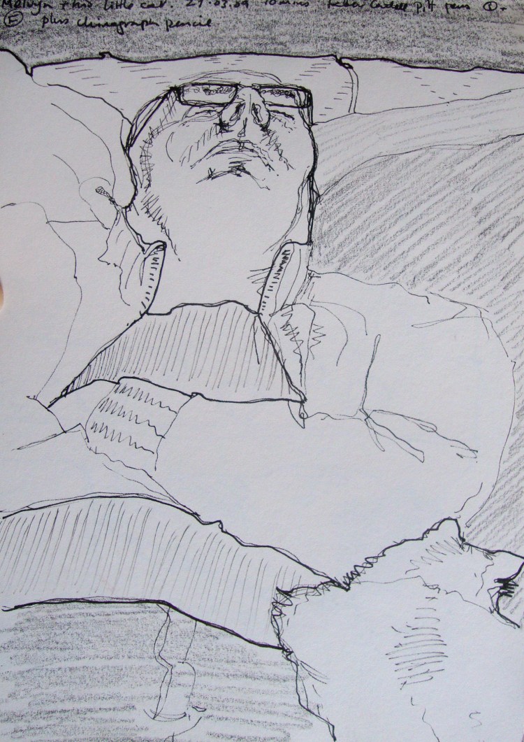 Just pulled a nine hour session at Swansea Print Workshop; exposed three new polymer [solar] plates and did 20 proofs from 7 plates and 3 blocks. On my feet all day and completely shattered now. And I forgot to take my camera so I can’t post the proofs I did. So here’s a drawing I did a while back of Husb and his kitteh, Ming the Merciless, asleep. Which is what I am going to be very, very shortly 🙂
